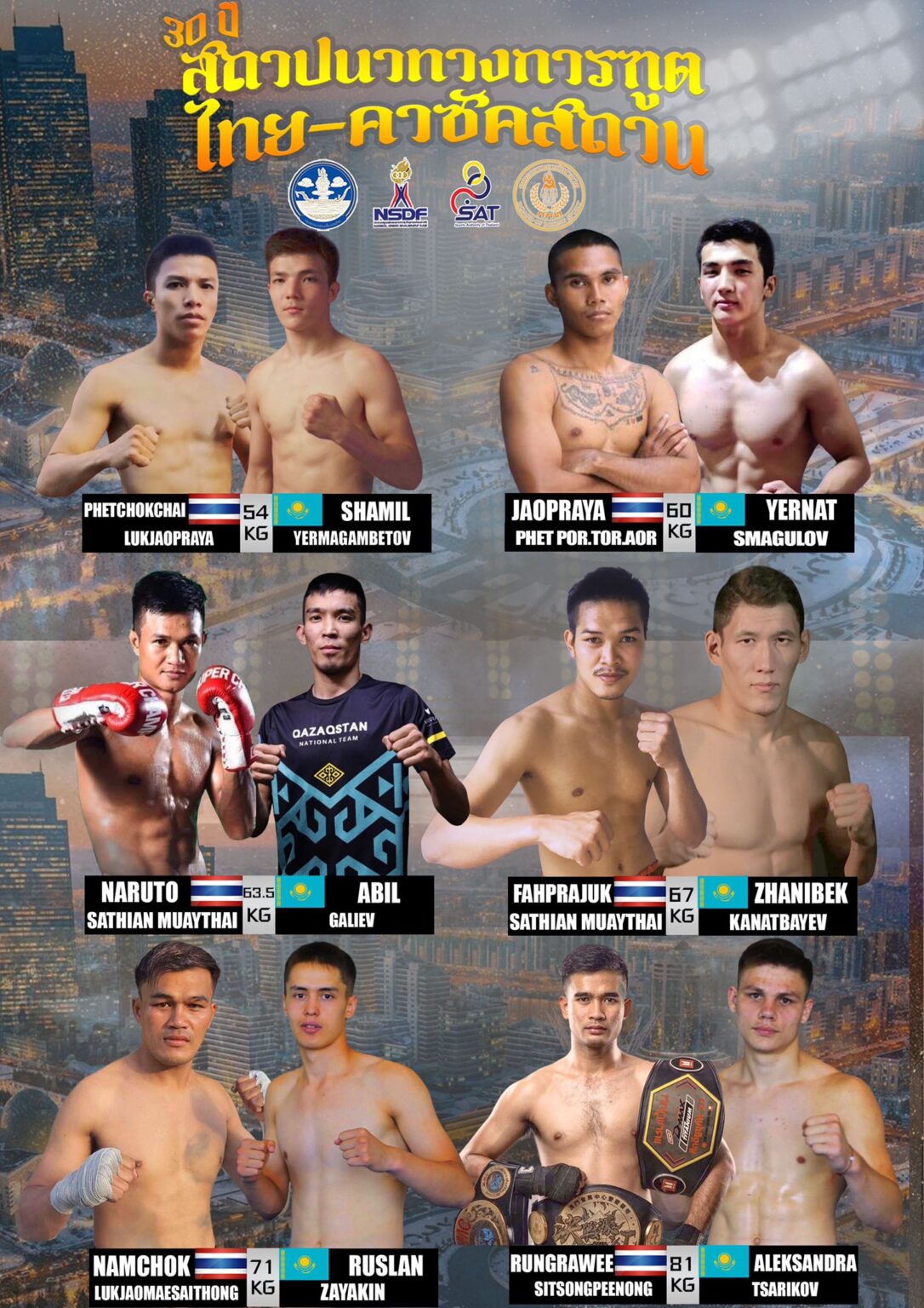 This is why a special event was organised in Almaty in cooperation with the Ministry of Foreign Affairs of Thailand and Kazakhstan, the national federations of Kazakhstan and Thailand sanctioned by the world governing body IFMA. The Sports Authority of Thailand and the National Sports Development Fund promoted the cultural aspects and the PAT and AMTAT the two national federations in Thailand worked together on the Thai team, Pi Muay and the demonstration team.
