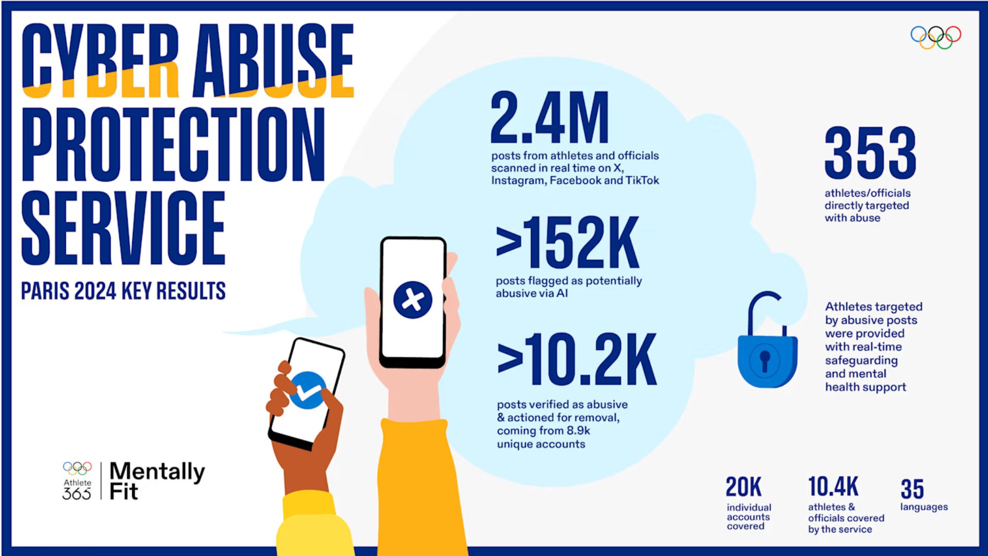 The Olympic Games Paris 2024 saw the implementation of the most comprehensive package of mental health initiatives in Olympic history, covering the entire mental health spectrum, including prevention and wellbeing. This included sport’s largest-ever online abuse prevention programme, which used artificial intelligence to analyse 2.4 million social media posts and comments in real time, and was supported by on-the-ground safeguarding and mental health support.