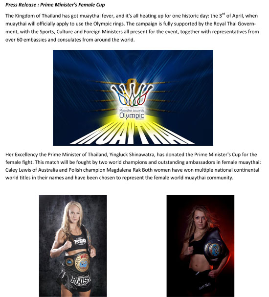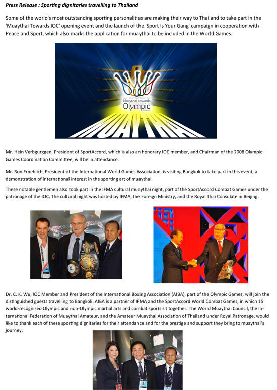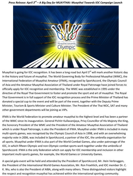 April 3rd- A big day for Muaythai: Muaythai Towards IOC Campaign Launch March 7, 2012 · 1 min read · News Previous Peace and Sport Presidents Cup, 3rd – 8th May 2012 February 29, 2012 · 1 min read Next International UMF Muaythai March 8, 2012 · 4 min read