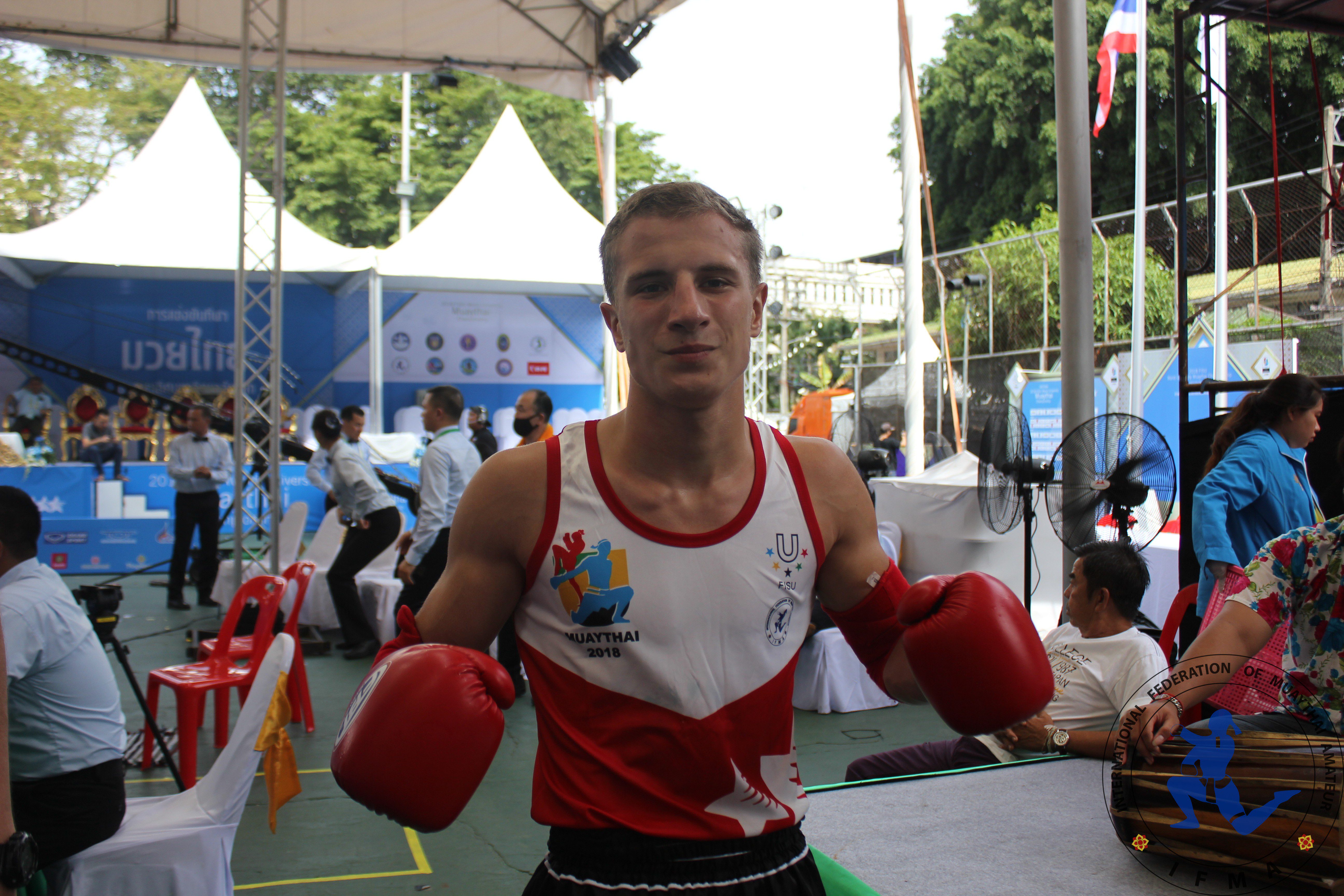 And at 81kgs Mikita Shostak (above) took the win against his Thai opponent Nattaphon Klangsombat. This time last year Mikita won bronze at The World Games and now he’s one step further to taking a medal at this FISU championships. His next opponent is Ali Dogan, Turkey who also won his bout today in a fast-paced and knee-strike-filled bout with Russia’s Arten Stratov.