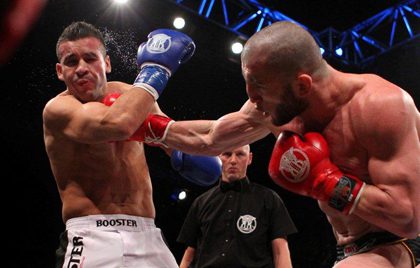 As expected in the WMC SUPERFIGHT -70Kg between Chahid Oulad El Hadj Vs Dzhabar Askerov, the two hard hitting veterans Chahid and Askerov wasted little time before engaging each other with wild striking combinations and kicks. Shots were traded between them with Askerov as the aggressor controlling the centre of the ring and Chadid countering with combinations. Two minutes in to the fight Askerov accidently kicked Chahid in the groin making the Marrocon fighter twist in agony on the canvass. When three minutes consisting of Chahid crawling on the mat had passed the referee gave Chahid a verbal warning that it was time to get up and fight but this only made Chahid twist and grunt even worse and so the referee started to count him out. Chahid did not stand up which resulted in an unsatisfactory TKO win for Dzhabar Askerov.