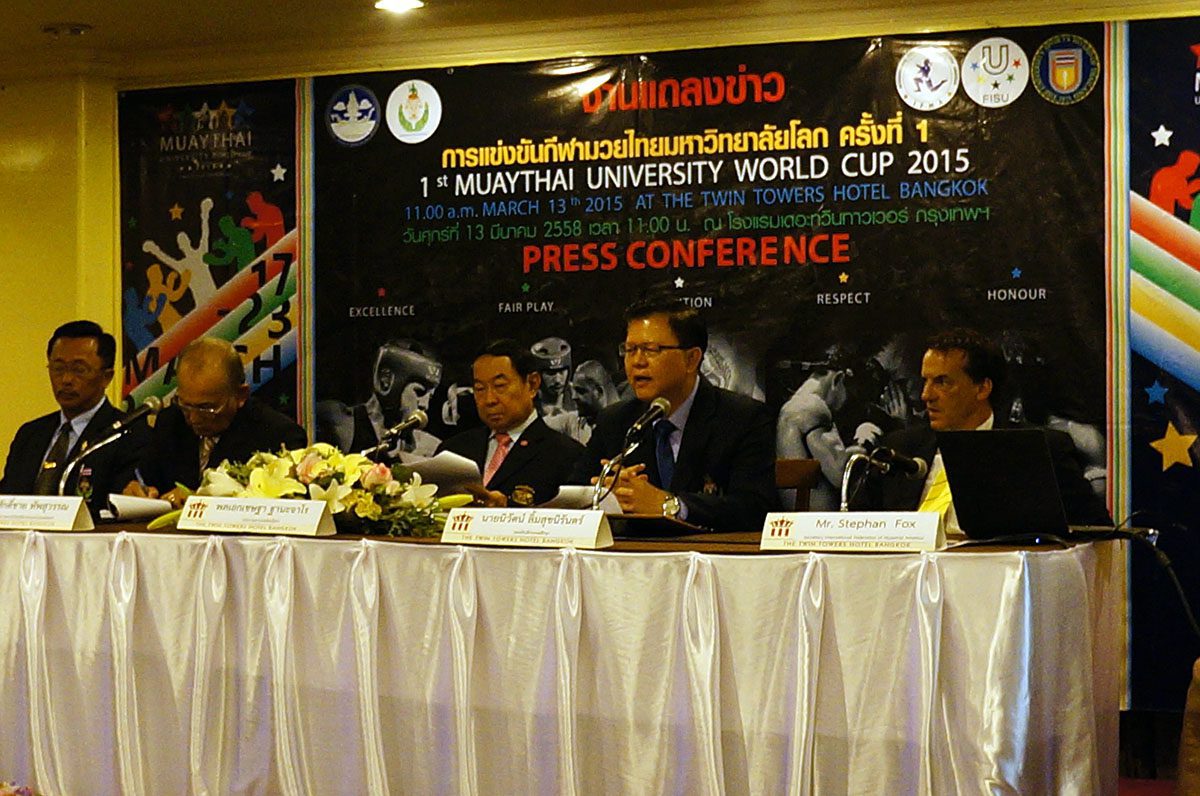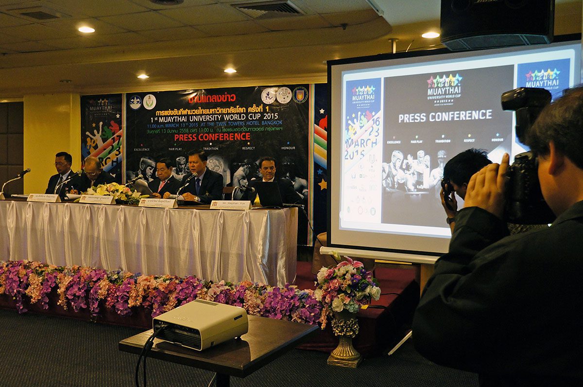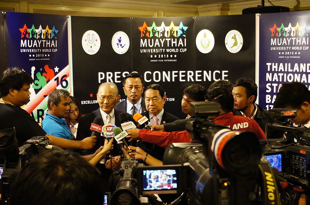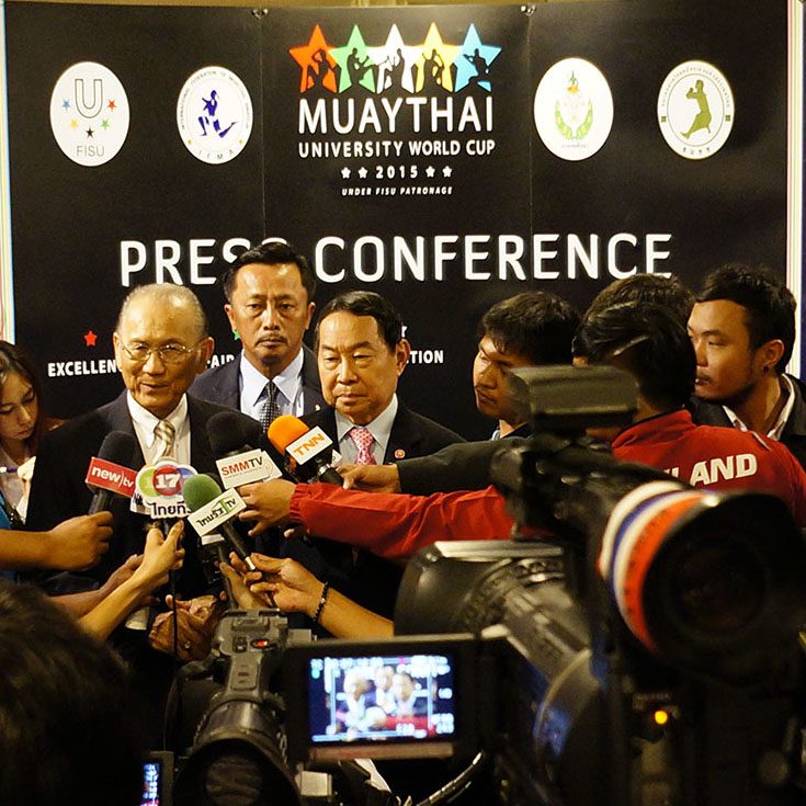 Over 50 press and TV agencies showed up to the press conference. General Chetta Thanajaro opened with a welcome speech stating that the Muaythai University World Cup is another important step in Muaythai’s journey towards IOC recognition. Mr Niwat Limsukneeran, from the Department of Physical Education, outlined the importance of education, sport for all and reiterated Muaythai’s push for IOC recognition. IFMA President Dr Sakchye Tapsuwan shared IFMA’s pride in last year’s inclusion of Muaythai in The World Games 2017, and this year FISU, another partner of the IOC, has given patronage to the Muaythai University World Cup. IFMA General secretary Stephan Fox made a presentation stating that 43 countries have been invited to the Muaythai University World Cup; bearing in mind 43 being the same number of countries in the first ever FISU Universiade in 1959.