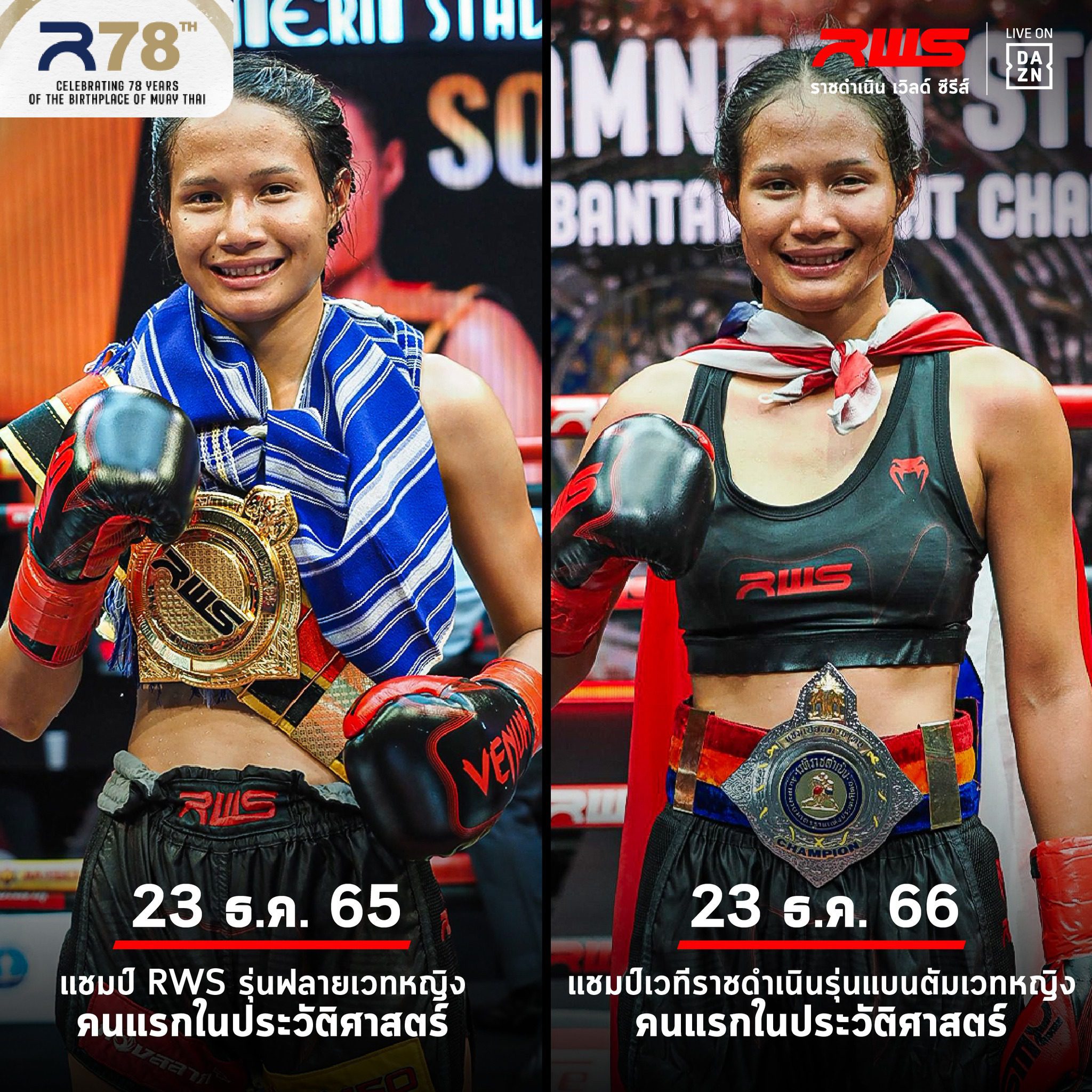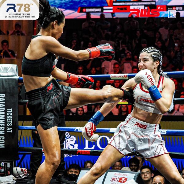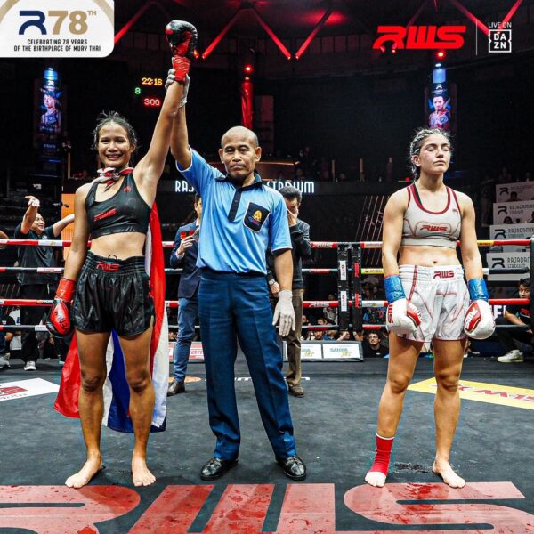 The first Rajadamnern title showcased the 2x RWS Champion, Somratsamee vs former IFMA World Champion Sevgi from Turkey fighting for the first Rajadamnern Female Bantamweight belt to ever be contested in Rajadamnern history. It was Somratsamee’s left kick vs Sevgi’s hands for 5 rounds of non-stop action in an exciting match between the two muay ying pouring their hearts onto the canvas for the title. In the end, it was Somratsamee being labelled the history maker making history at Rajadamnern on the 23 December 2022 as the first RWS Female Flyweight Champion and again on December 23, 2023 as the first Rajadamnern Stadium Female Bantamweight champion.
