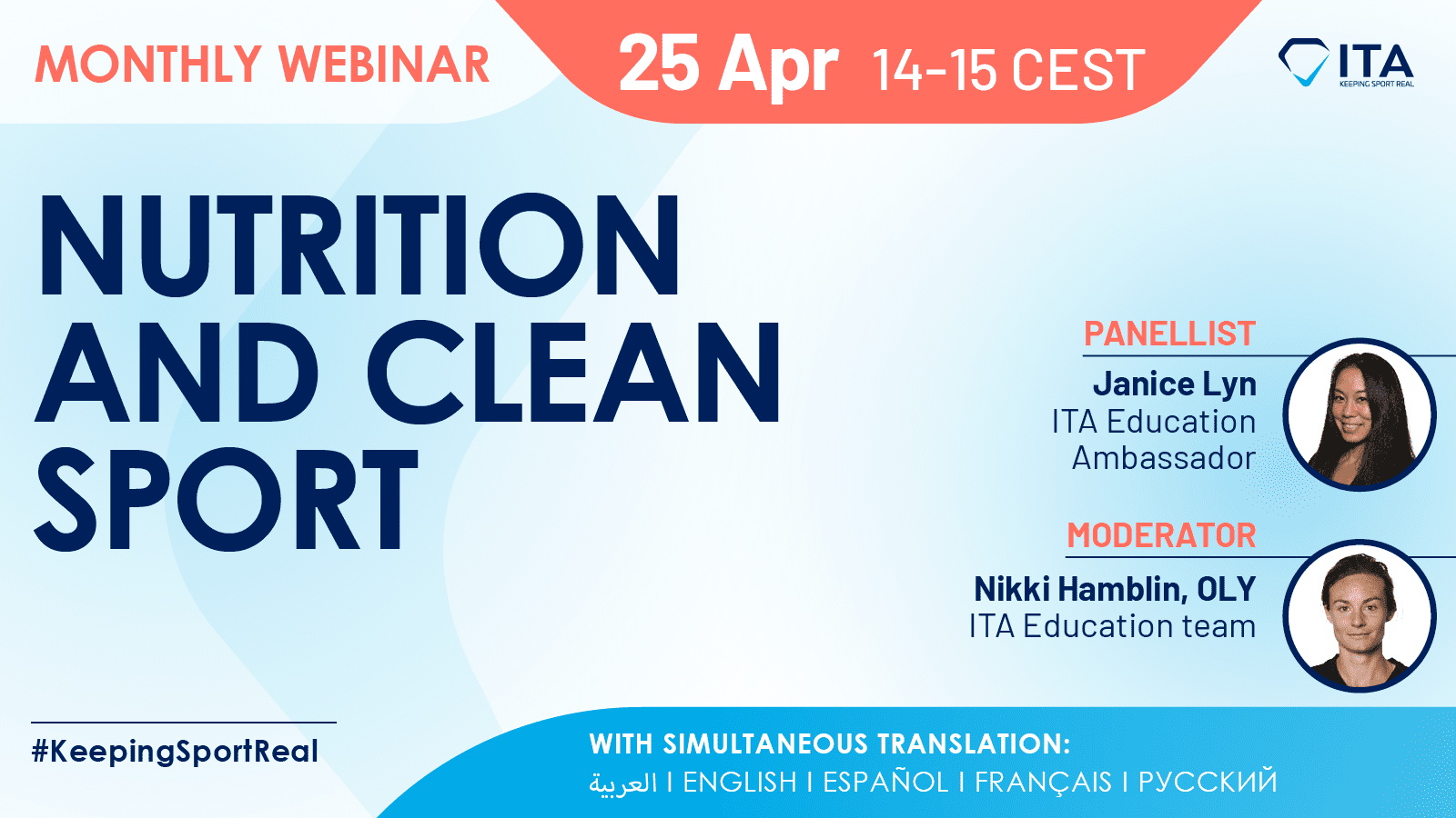 Topic: Nutrition and Clean Sport Date: Thursday, April 25 Time: 14:00 – 15:00 CEST Registration Link: Register Here