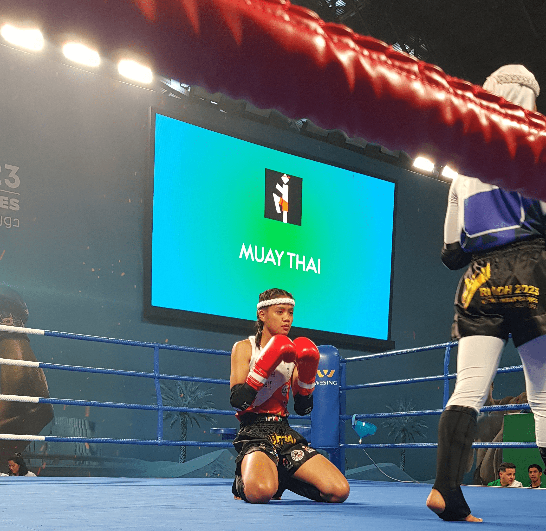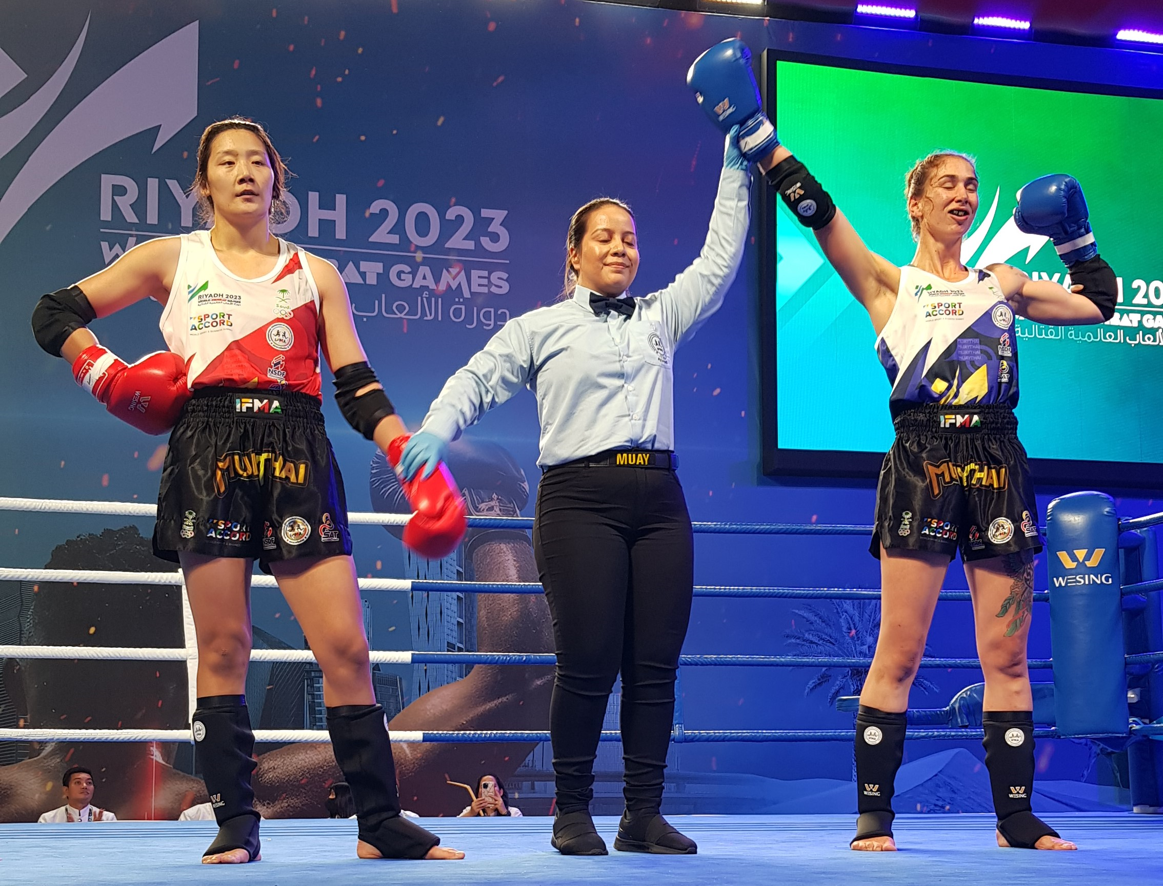 In the 57kg female division Thailand’s Kaewrudee Kamtakra didn’t waste any time stopping the home team’s Raneem Alsharif in the first round. Neutral Athletes’ Maria Klimova edged out Australia’s Bryony Soden to seal her spot in the semi-finals.