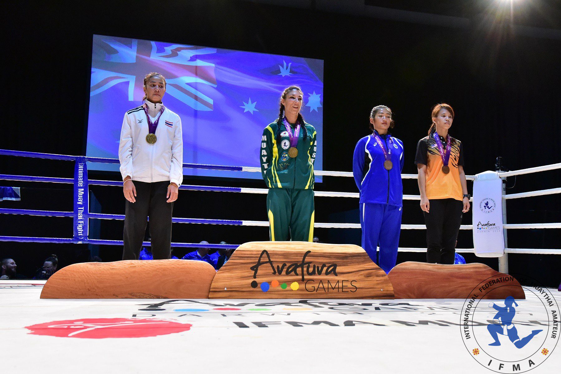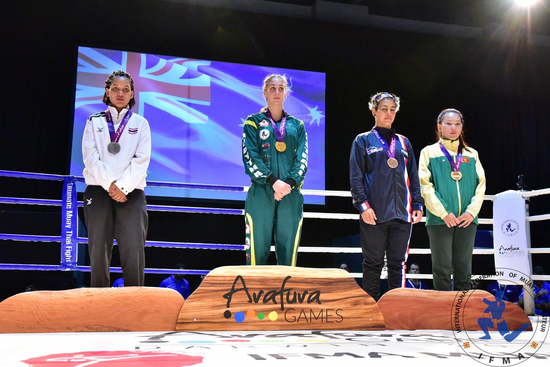 Seven today’s finals included five Australian athletes with Zoe Putorak opening the day against Janejira Wankrue from Thailand. Qualification for the World Games 2021 was at stake and both athletes were full of determination to be the first to win the spot in 63.5 kg in Birmingham. Janejira made an impressive appearance at her previous bout finishing it in the first round against Nga Truong Thi Hong (VIE). For Zoe it was hard three round clash with Nora Cornolle (FRA). Zoe must have studied the strong side of her opponent befre the final bout and was stronger in each of three round securing confident gold for her team.