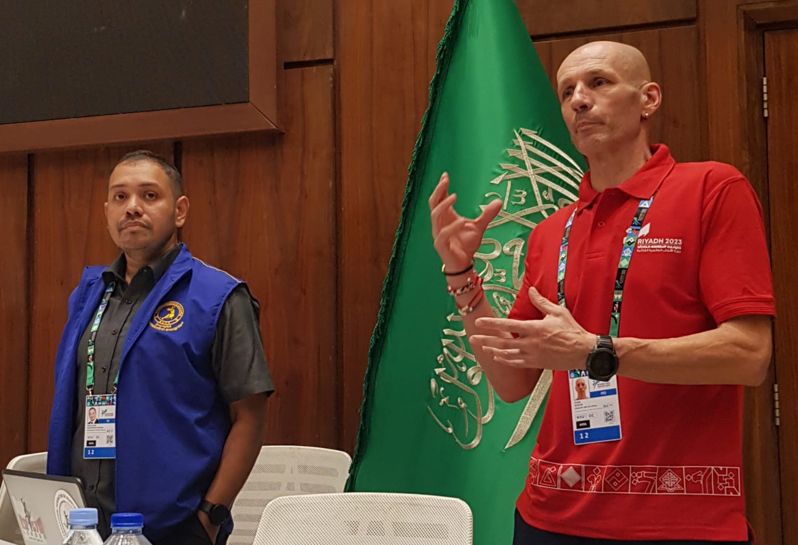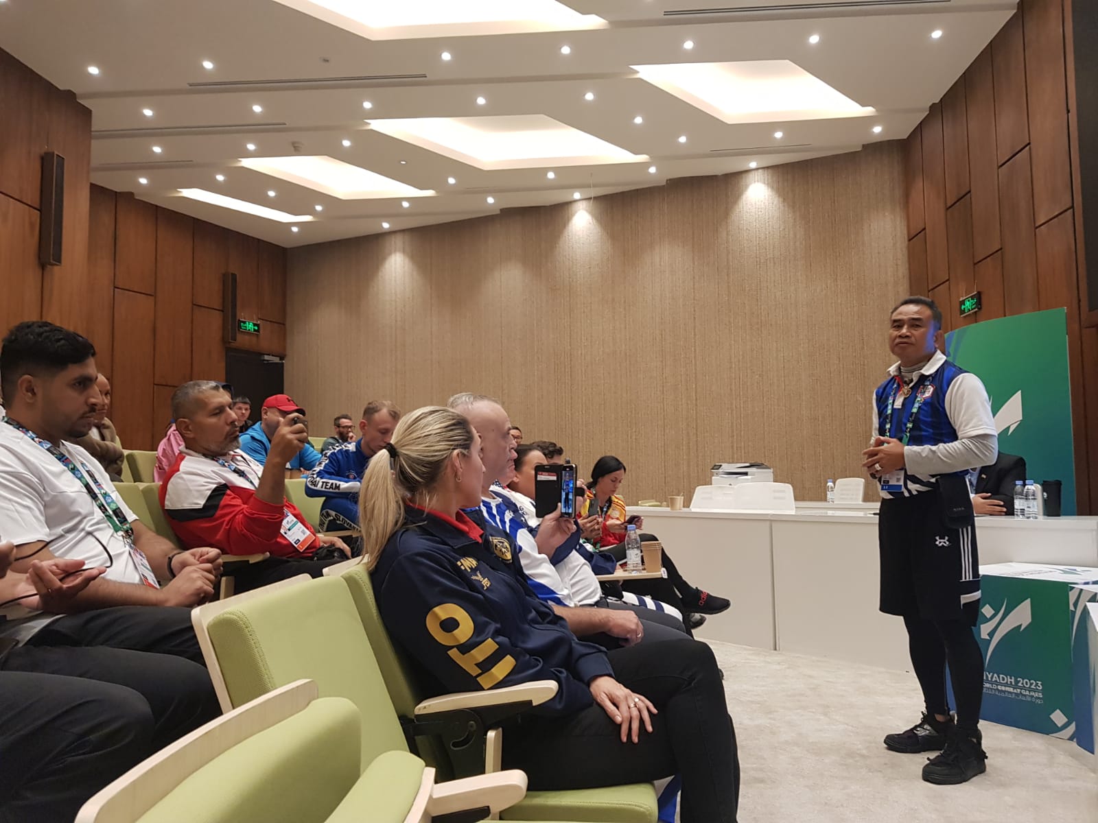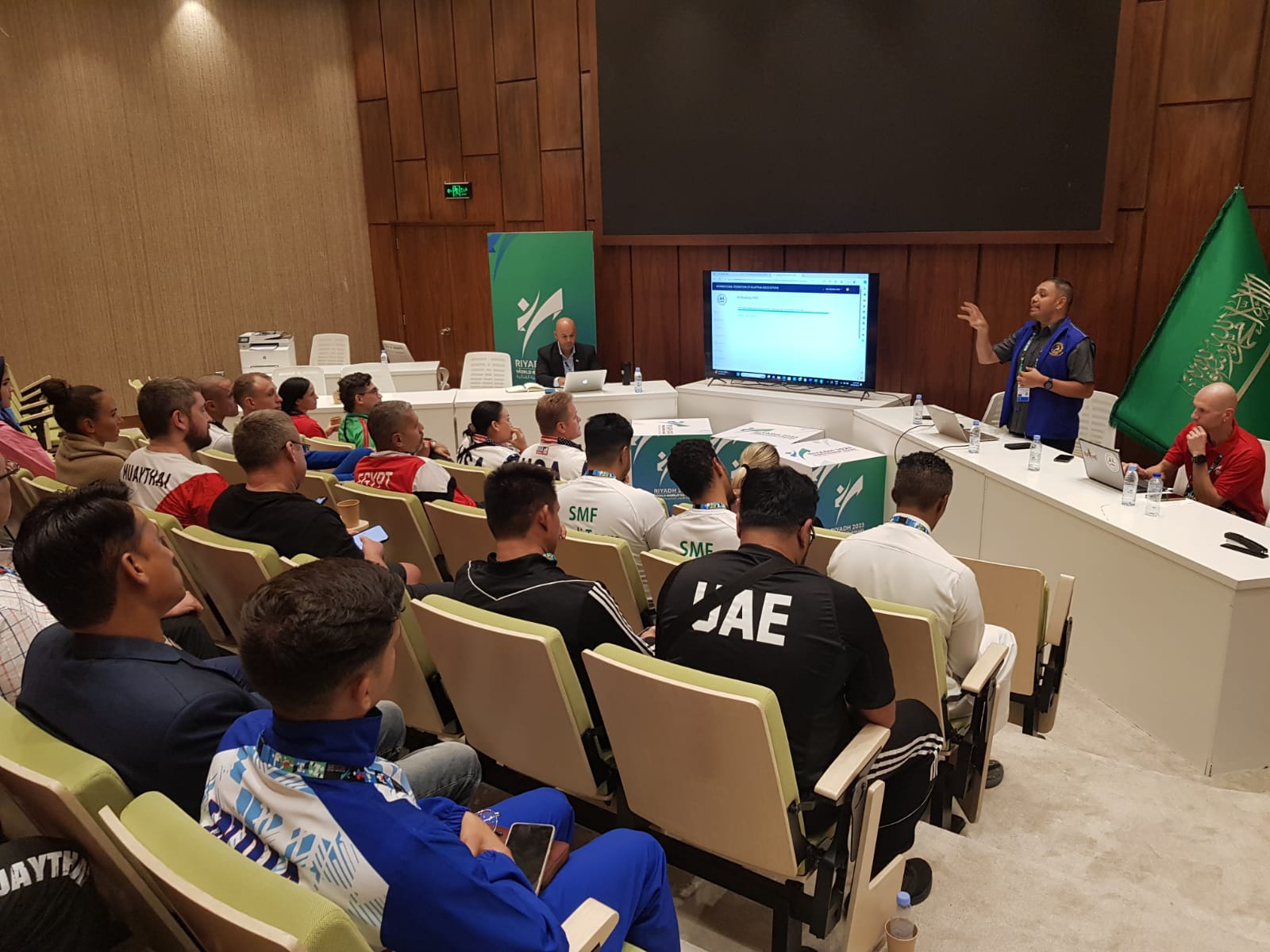 The IFMA Team Managers Meeting took place at the Saudi Olympic Complex in Riyadh where over 33 countries and neutral countries were in attendance. The Team Manager Meeting was led by IFMA Technical Delegate of the World Combat Games, Dato Shahnaz Azmi, Head ITO, Gunter Plank, Member of the Culture and Heritage Commission, Ajahn Sawaeng, Vice Chair of the Education Commission, Ryan Rudkin and IFMA Director General, Charissa Tynan.
