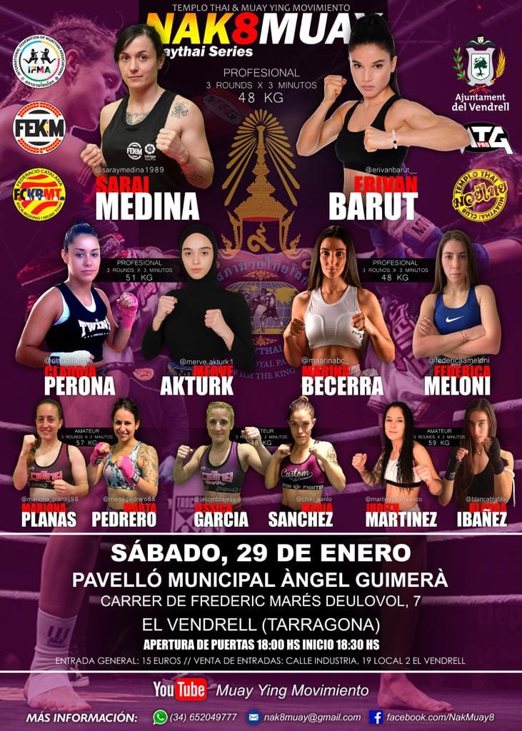 Nak Muay 8 Muaythai Series will be held in the beautiful city of El Vendrell, Tarragona, Spain. The event is supported by Muay Ying Movimento and sanctioned by the WMC and boasts a solid card of the best of the best female Spanish and European fighters.