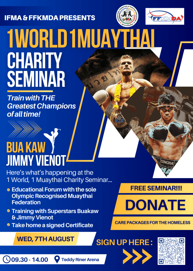 Buakaw has been an integral part of IFMA and WMC for over 20 years. A multiple-time world champion and esteemed ambassador, he recently conducted a charity workshop during SportAccord 2024, just three months ago. In Paris, muaythai legend, Buakaw, will perform at Club France and, together with French superstar, Jimmy Vienot, will organise a charity seminar at Baan Muaythai on the 7th free of charge.