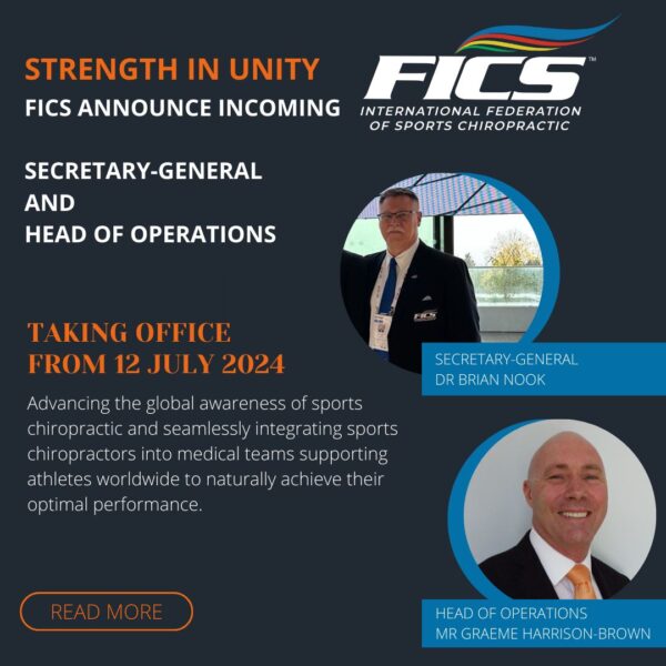FICS made waves with the announcement of Dr. Brian Nook’s appointment as the incoming Secretary General, alongside Graeme Harrison-Brown as the Head of Operations. This dynamic duo, set to assume their roles effective July 12, 2024, embodies a vision of unity and progress for sports chiropractic on a global scale.