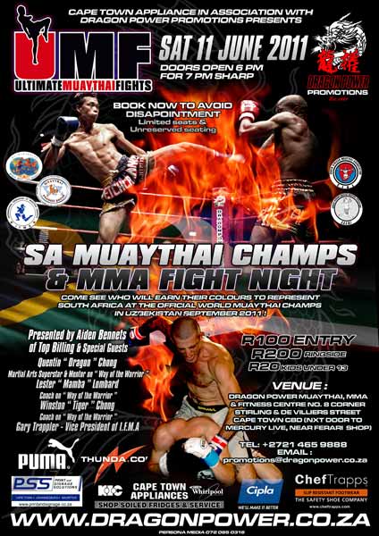 Sifu Kru Quentin ‘Dragon’ Chong, Sibak Kru Winston ‘Tiger’ Chong and Kru Lester ‘Mamba’ Lombard coordinately invite you to the UMF South African Muaythai & MMA Fight Night on the 11th of June 2011, 6pm for 7pm sharp start @ Dragon Power Muaythai, MMA & Fitness Centre, C/O De Villiers & Stirling St (Next door to Mercury live).