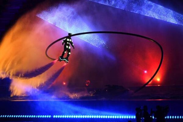 - A dramatic aquatic segment with jet skis and flyboard stunts